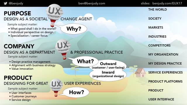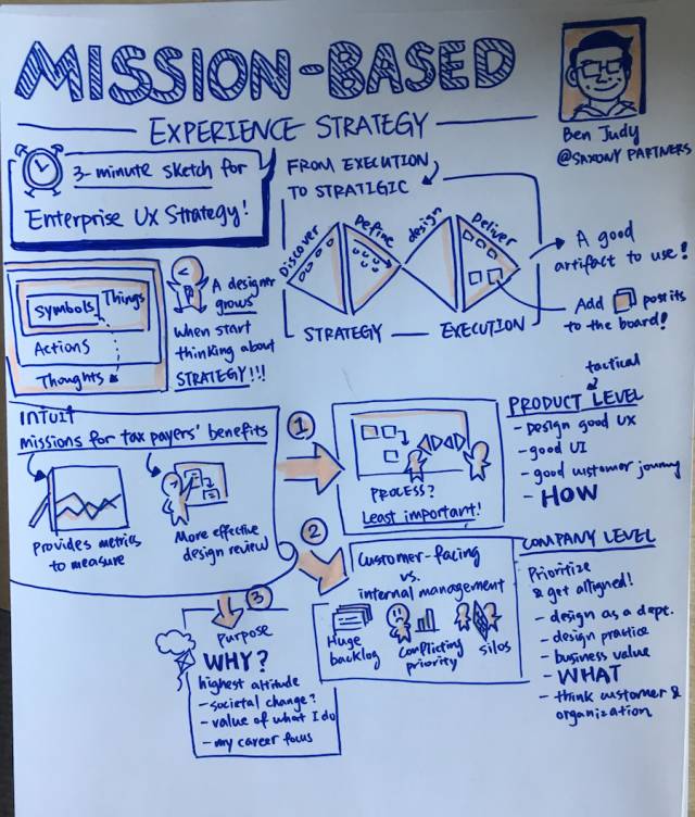 这些想法当然在我工作的两年多中逐渐发生变化,但是,直到前些日子才有了质的变化。我在 UXPin 组织的 Enterprise Virtual Summit,一个针对企业设计师的线上会议中听了 Ben Judy 的 talk: Mission-Based Experience Strategy,突然醍醐灌顶,非常有共鸣和帮助,对自己之前的想法推翻了很多,开始比较主动的去重新看公司的这些我以前比较排斥的东西,思考作为企业环境里的设计师应该如何成长。